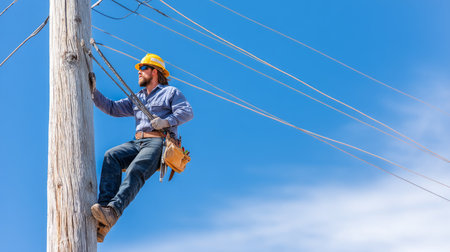 An electrician climbs a utility pole to repair power lines. The bright sky provides a stunning backdrop as the worker performs essential electrical maintenance on the lines.