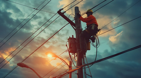 A technician wearing safety gear climbing a utility pole to inspect or repair power lines, ensuring reliable electricity transmission.