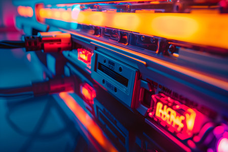 Network server rack with connected cables and flashing lights illuminating the scene with vivid colors