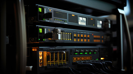 close-up of server rack with blinking lights and cables, created with generative ai