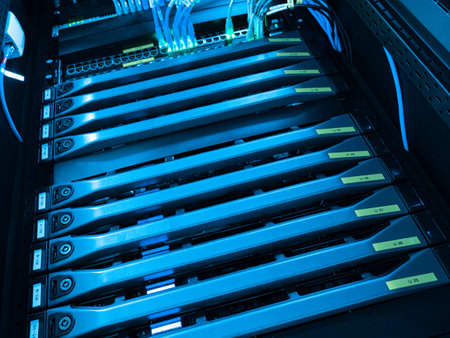 Multiple data storage devices are seen in a server rack, showing green lights in a tech environment.