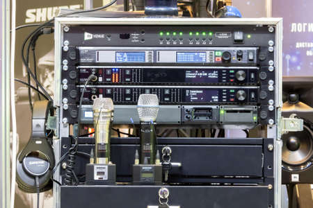 lot of special wireless equipment for simultaneous translation at conferences, presentations, information and training activities in a special box.