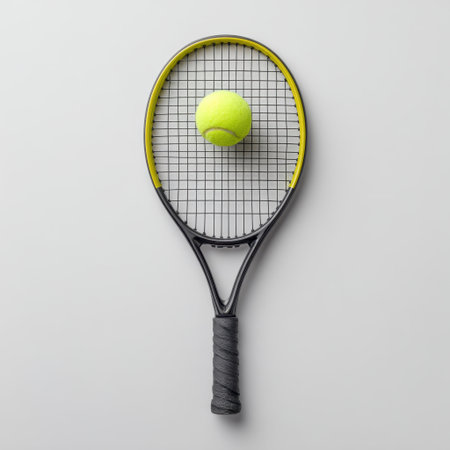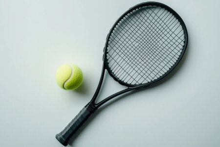 tennis racket and a bright yellow ball lie side by side on a white background illuminated by midday light. The detailed strings and grip focus highlight the sleek design of sports accessories.