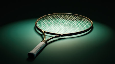 A classic tennis racket lies on a vibrant green background, symbolizing sport and activity. Ideal for promoting fitness, competitions, or leisure activities.