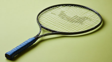 This image features a close-up shot of a tennis racket showcasing a black frame and blue grip, set against a light green backdrop. Perfect for sports themes.