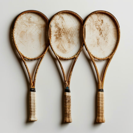 Three vintage tennis rackets arranged neatly on a neutral background, showcasing their wear and tear. Ideal for themes in sports history or nostalgic decor.