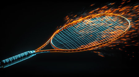 A stunning tennis racket featuring a sleek design and bright illumination against a dark background, showcasing sports activity and performance.