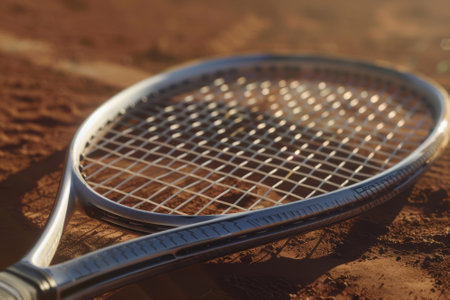 Close-Up of Aluminum Tennis Racket on Clay Court for Sports Equipment Design