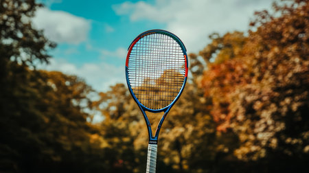 Outdoor Tennis Racket on Grass During a Sunny Afternoon Surrounded by Colorful Fall Foliage Trees