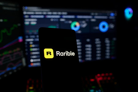 Dhaka, Bangladesh 18 September 2025:Phone displays Rarible logo with crypto coins and trading graph in background
