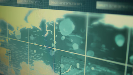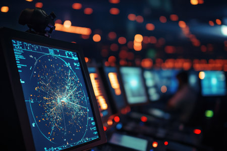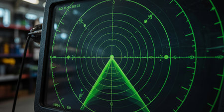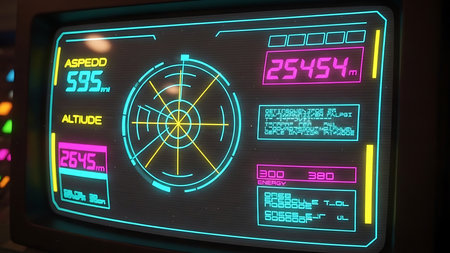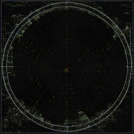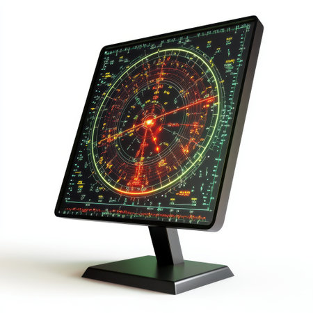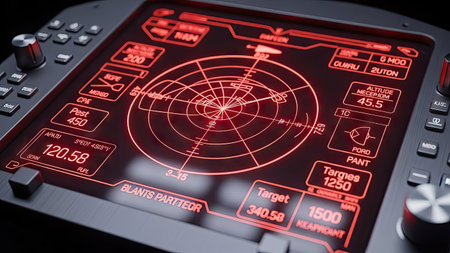 A close-up view presents a digital radar screen emitting a vibrant red glow. Various data displays and a circular target map are visible. The composition focuses on the technological details, with clean lines and a modern aesthetic. Suitable for presentations or illustrating technology concepts, with potential use in design and editorial projects.