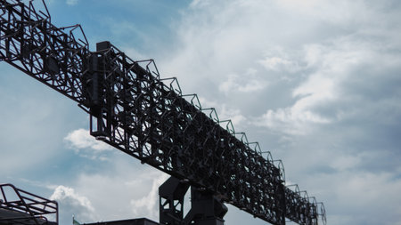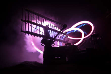 Silhouettes of satellite dishes or radio antennas against night sky. Space observatory or Air defense radar over dramatic night sky. Creative artwork decoration. Selective focus