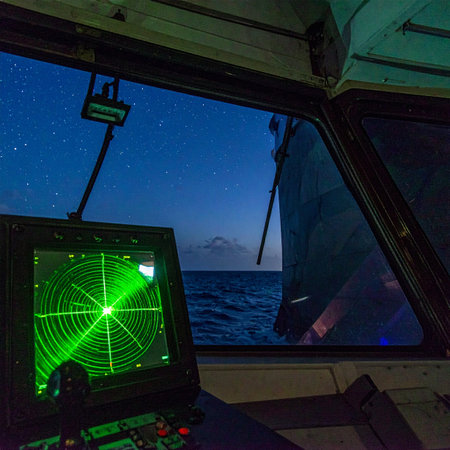 From the quiet, dark interior of a ships bridge, a glowing green radar screen provides vital navigation data. Through the window, the calm ocean stretches out to the horizon under a starry pre-dawn sky, evoking a sense of vigilance, technology, and solitary journey.
