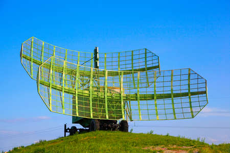 creative art decoration. military concept. Air defense hardware workplace vintage style. Satellite dishes or radio antennas against control equipment. low key. selective focus.