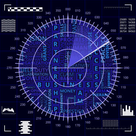 Radar screen with different business words of blue and white shades