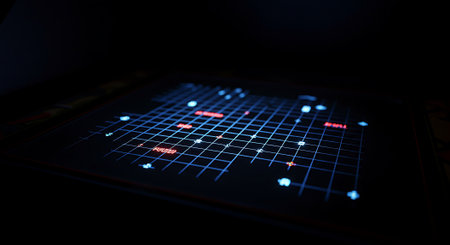 Close up of a luminous digital interface with a grid and glowing nodes representing complex data, technology, or a futuristic game in a dark environment.