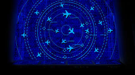 Workplace of the professional air traffic controller in the control tower. Caucasian aircraft control officer works using radar, computer navigation and digital maps. Aviation concept.