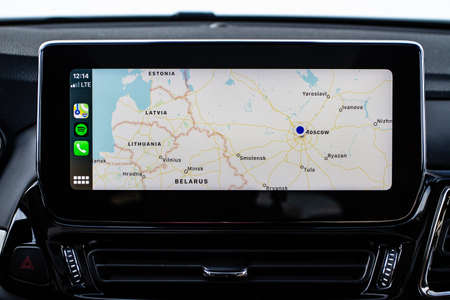 MOSCOW, RUSSIA - FEBRUARY 23, 2021 CHERYEXEED TXL SUV car interior view. Chery Exeed TXL / Vantas TXL. Car media close up view. CarPlay on the screen. Screen with maps.