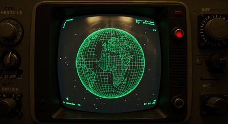 A retro-futuristic data display shows a luminous green grid globe against a dark background, set within an intricate control panel of an old communication system.