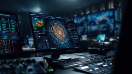 Advanced technology displays vibrant data visualizations in a sophisticated control room at night.