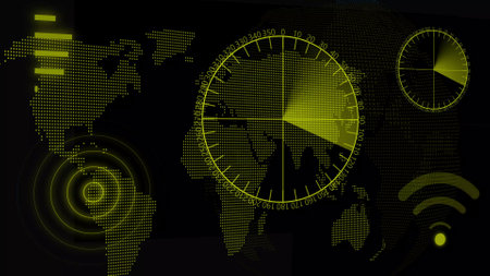 Digital technology green color radar screen with radio wave dots particles combined world map.
