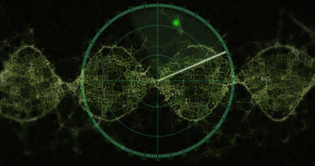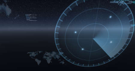 Image of radar with spots moving on black background. radar and digital interface concept digitally generated image.