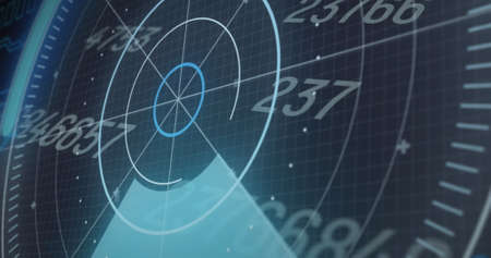 Radar image with digital circuits and data processing over blue grid background. technology, scanning, navigation, futuristic, electronics, computing