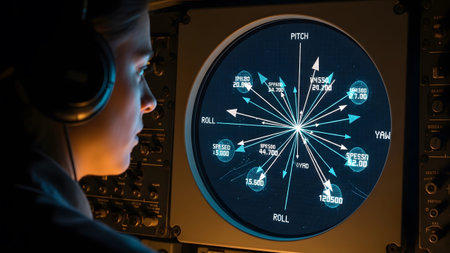 A woman in headphones observes a circular screen displaying colorful and numbers, suggesting...