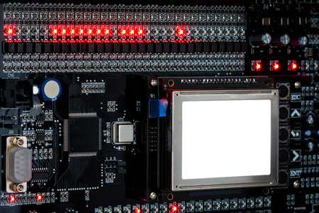 The vintage of chipset digital on red board and black background with a light focus