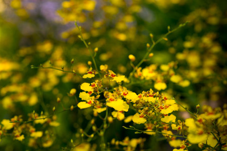 Small yellow wild flowers grow in summer garden with beautifull soft bokeh