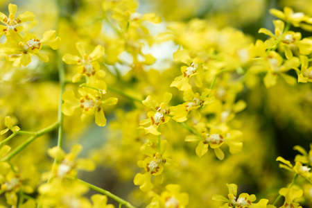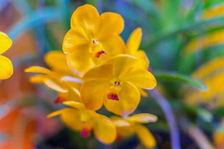 Orchid flower in yellow orange in the garden. Beautiful and colorful yellow Phalenopsis Orchid plants in the garden in Spring under the sun