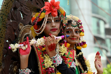 Delhi, India - September 9, 2019 : Cute Indian Kids dressed up as little Lord Krishna Radha on the occasion of Krishna Janmastami Festival in Delhi India
