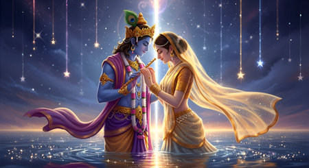 A Krishna Radha spiritual artwork water reflection flute with garland jewelry peacock feather crown and night sky star background for Janmashtami Radhashtami Holi festival celebration art print