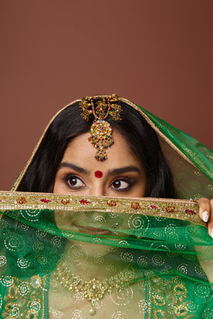 vertical shot of beautiful indian woman in with bindi dot covering face with veil and looking away