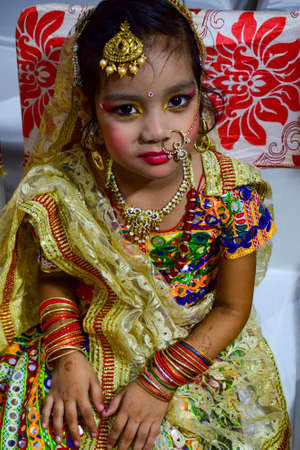 Dhaka, Bangladesh - September 23, 2020: Young pretty bengali girls are ready for a dance performance in the cultural program. Before going to the stage, they are continuing their rehearsal for betterm