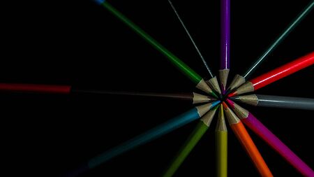 spiral arrangement of sharpened pencils on black background, artistic concept