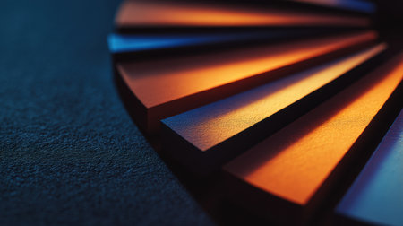 Colorful geometric shapes create striking visual effect with gradients of orange and blue. interplay of light and shadow enhances texture and depth, evoking sense of modern design