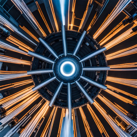 Abstract geometric starburst pattern in a captivating array of blues, browns, and oranges with a strong vanishing point perspective. AI Generation