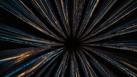 This image captures a mesmerizing burst of light that radiates from the center, creating a stunning display of blue and gold streaks. The vibrant lines spread out in all directions, evoking a sense of energy and movement. The contrast between the dark background and the bright, colorful lines adds to the visual impact, making it appear as if the light is exploding or spreading outwards in a cosmic dance.