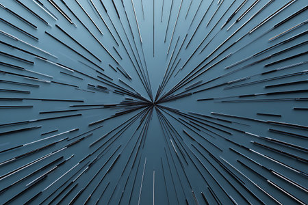 Numerous thin metallic rods radiate outwards from a central point against a smooth blue surface creating an abstract explosion effect.