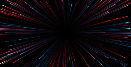 An abstract digital illustration showcases a dynamic flow of light trails. The artwork features streaks of blue, red, and white against a black backdrop, suggesting high-speed data transfer. The composition has an immersive perspective. This imagery is suitable for technological and scientific projects.