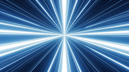 This image depicts a dynamic and futuristic scene with numerous blue light streaks radiating from a central point. The lines create a sense of motion and speed, suggesting the concept of high velocity or time travel. The background is a gradient of deep blue, enhancing the futuristic and technological feel of the image.