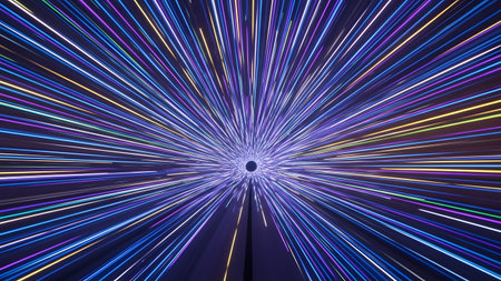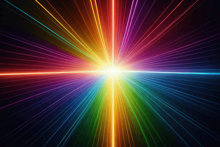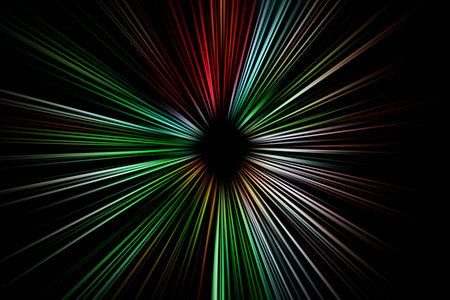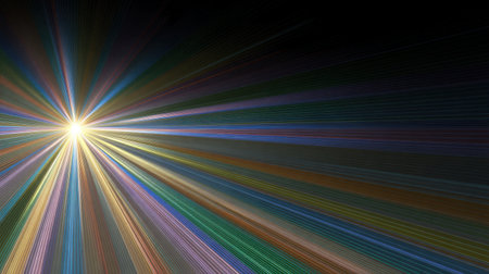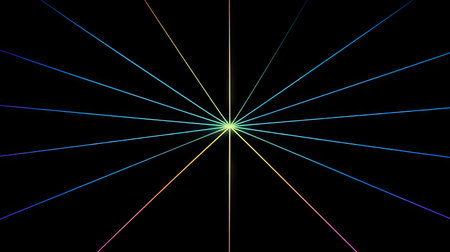 Abstract visual composition featuring radiating lines from a central point. The lines are in gradient colors on a dark background. The scene suggests a sense of expansion and energy. Suitable for technology, design, and illustrative applications. The composition offers ample copy space and is ideal for various commercial projects.