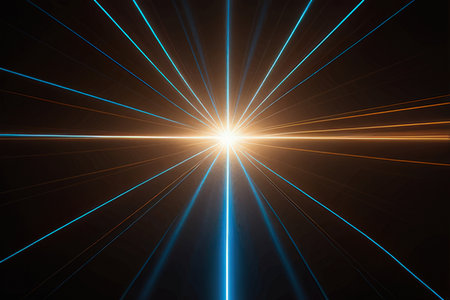 This image captures a mesmerizing burst of light emanating from a central source, creating a dazzling array of lines that radiate outward in all directions. The vibrant colors of orange, yellow, and blue create a sense of depth and movement, evoking a feeling of speed and energy. The intricate patterns formed by the light streaks give the impression of a cosmic event or a futuristic technological phenomenon.