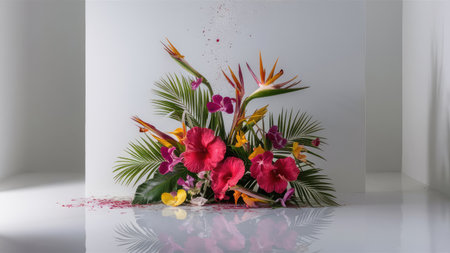 A vibrant arrangement of tropical flowers, including hibiscus and bird of paradise, is displayed against a stark white background, creating a striking visual contrast.