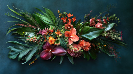 An artistic top view of a floral arrangement with exotic flowers and greenery.