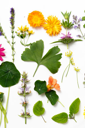 Flat lay with a variety of flowers and leaves on a white background. AI generative