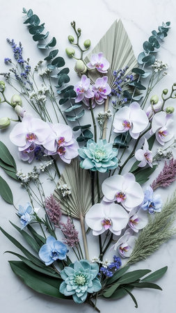 An floral arrangement showcases white and purple orchids, eucalyptus leaves, and dried palm fronds artfully placed on a white marble surface.