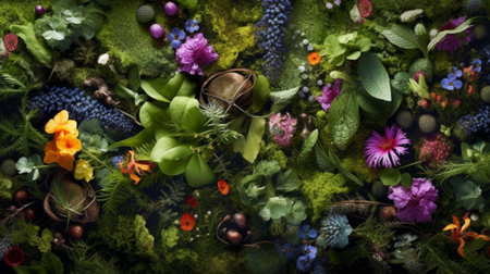 A vibrant array of fresh plants and flowers creatively arranged on a soft green background, perfect for nature themes and wellness concepts.