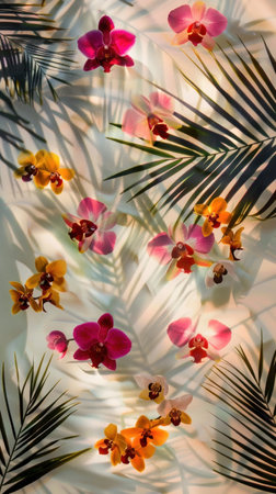 A beautiful arrangement of tropical flowers, creating an exotic and colorful background